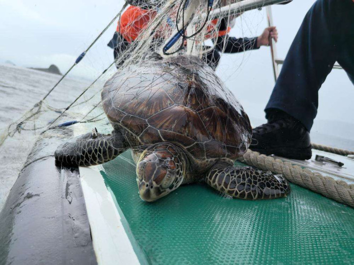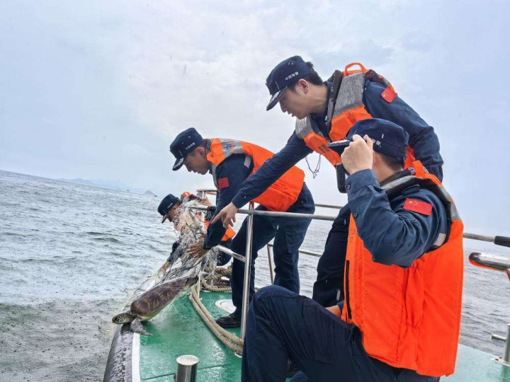 执法员见状,立即展开救援行动,利用钩杆小心翼翼地将海龟牵引至执法艇旁,随后用剪刀剪断勒入皮肉层层缠绕的渔网,将其解救出来。